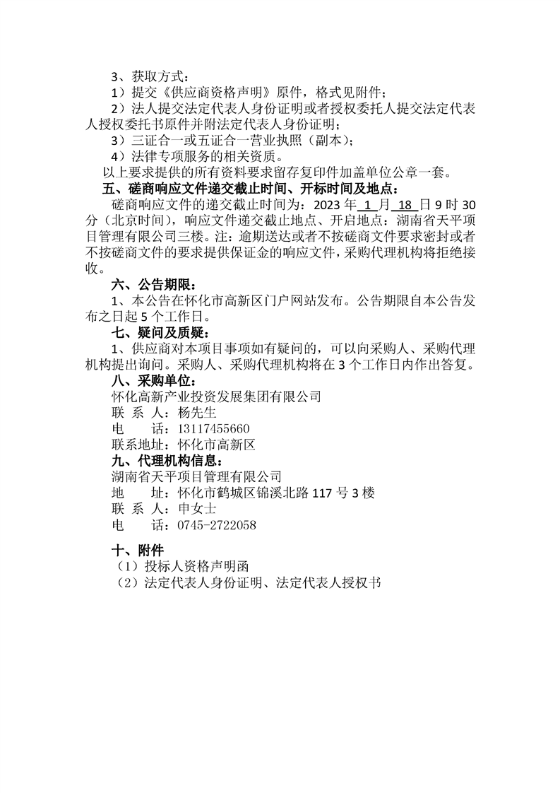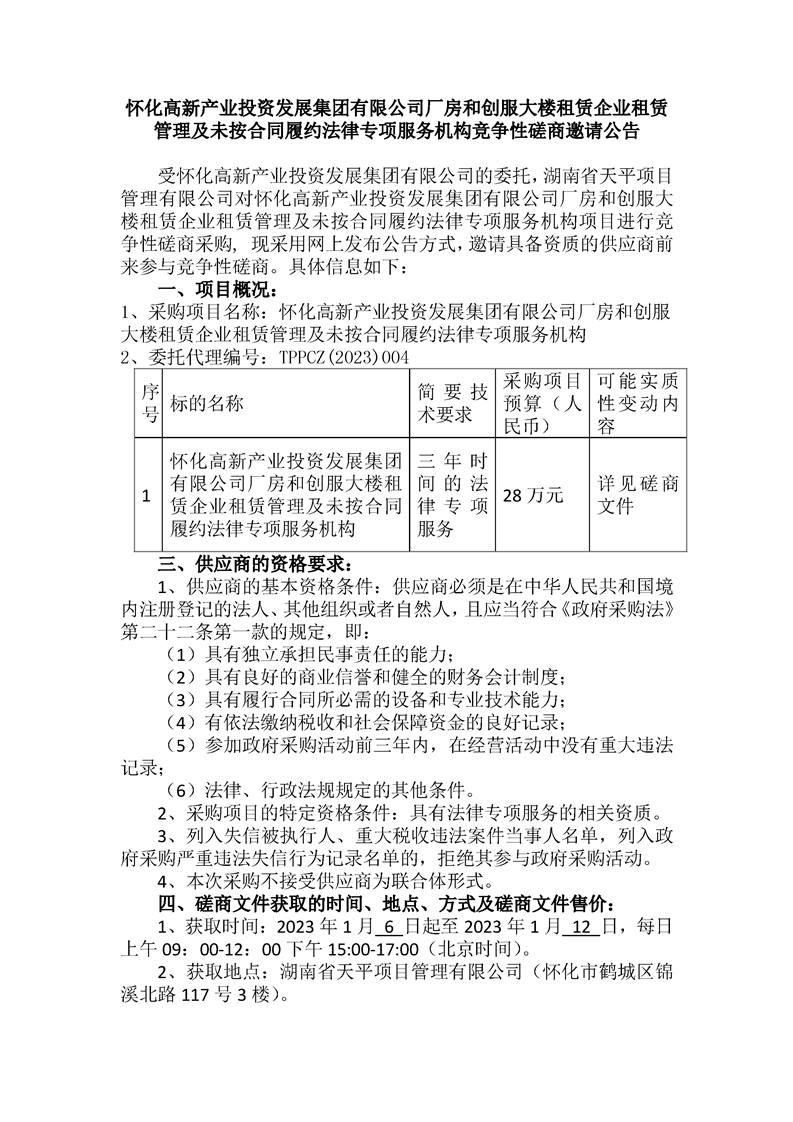 湖南 怀化高新产业投资发展集团有限公司厂房和创服大楼租赁企业租赁管理及未按合同履约法律专项服务机构竞争性磋商邀请公告