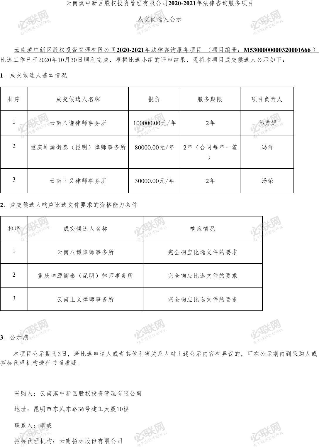 云南滇中新区股权投资管理有限公司2020-2021年法律咨询服务项目招标评标公示