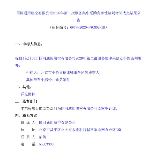 北京国网通用航空有限公司2020年第二批服务集中采购竞争性谈判增补成交结果公告