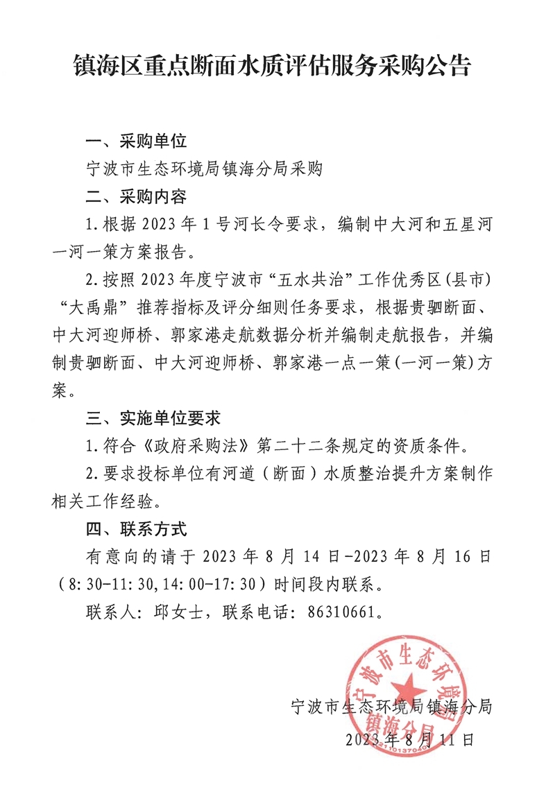招标公司受业主委托,于2023-08-14在网上发布:镇海区重点断面水质评估服务项目采购公告。各有关单位请与公告中招标负责人接洽联系,及时开展投标及相关工作,以免错失商业机会。