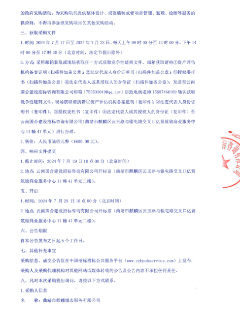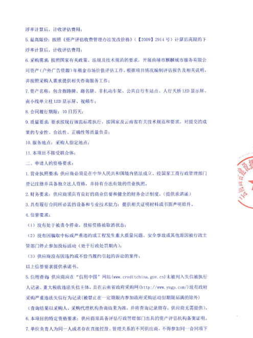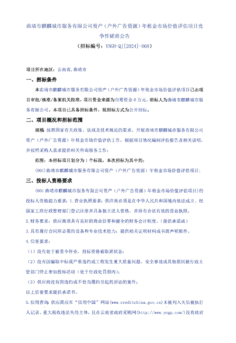 云南评估曲靖市麒麟城市服务有限公司资产(户外广告资源)年租金市场价值评估项目竞争性磋商公告