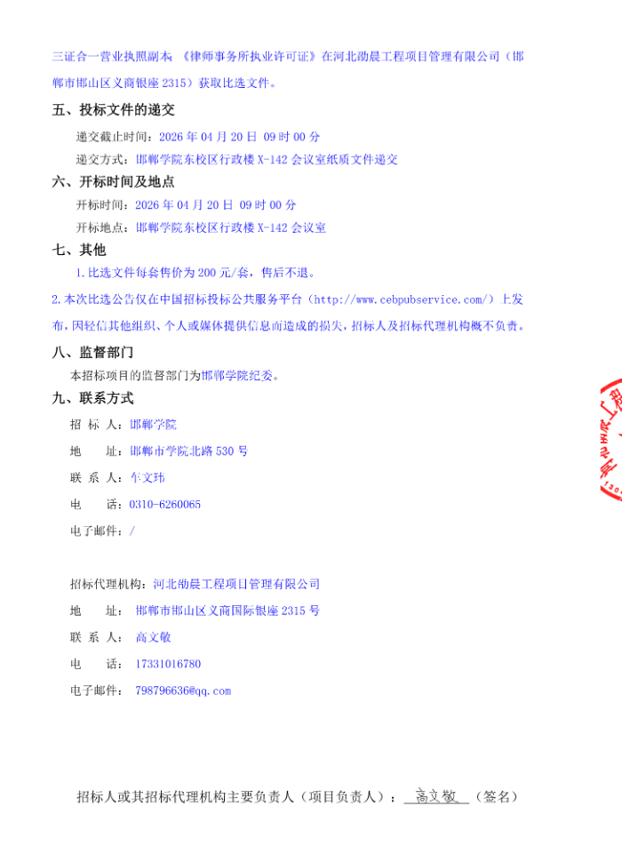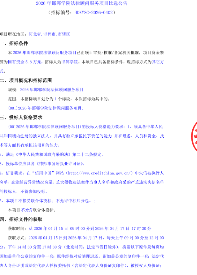 河北2026年邯郸学院法律顾问服务项目比选公告